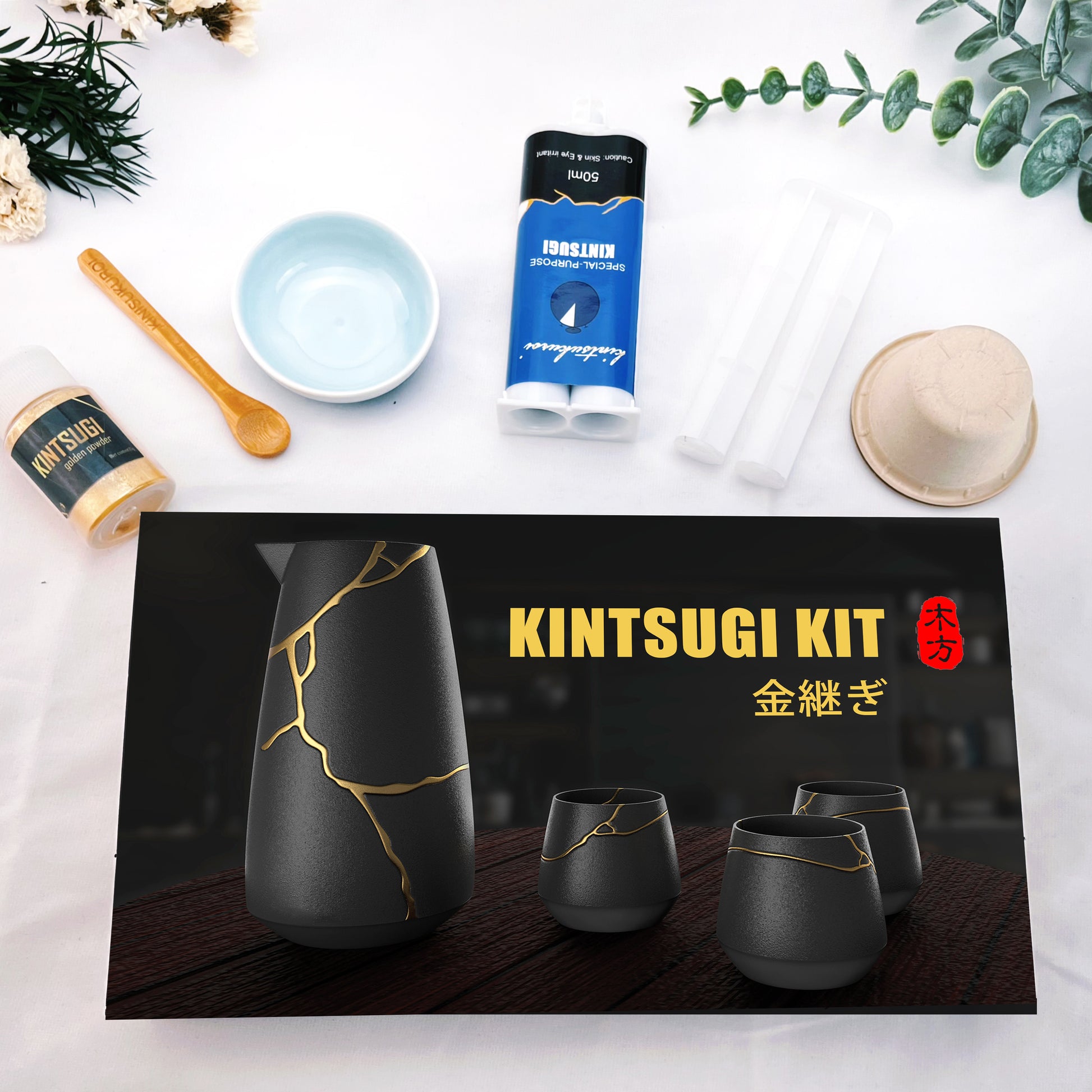 Kintsugi Repair Kit, Repair Your Meaningful Pottery with Gold Powder 50ml Glue, Japanese KINTSUGI Ceramic Repair Starter Kit- an Practice Ceramic Cups Free for Kintsukuroi Beginner