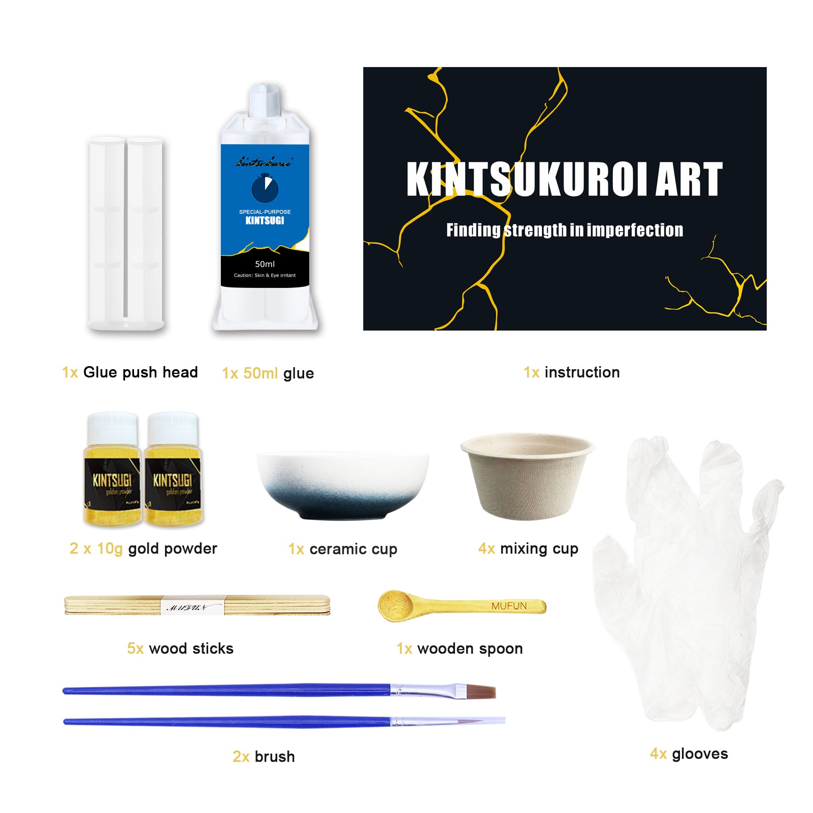 - 【EXCELLENT KIT】 MUFUN Kintsugi repair kit includes 2 bottles of gold powder, 2pcs beautiful ceramic cups for practicing, and 1pcs AB glue. Enough for you to get the skill of kintsugi, also you can use it to repair several meaningful potteries.
