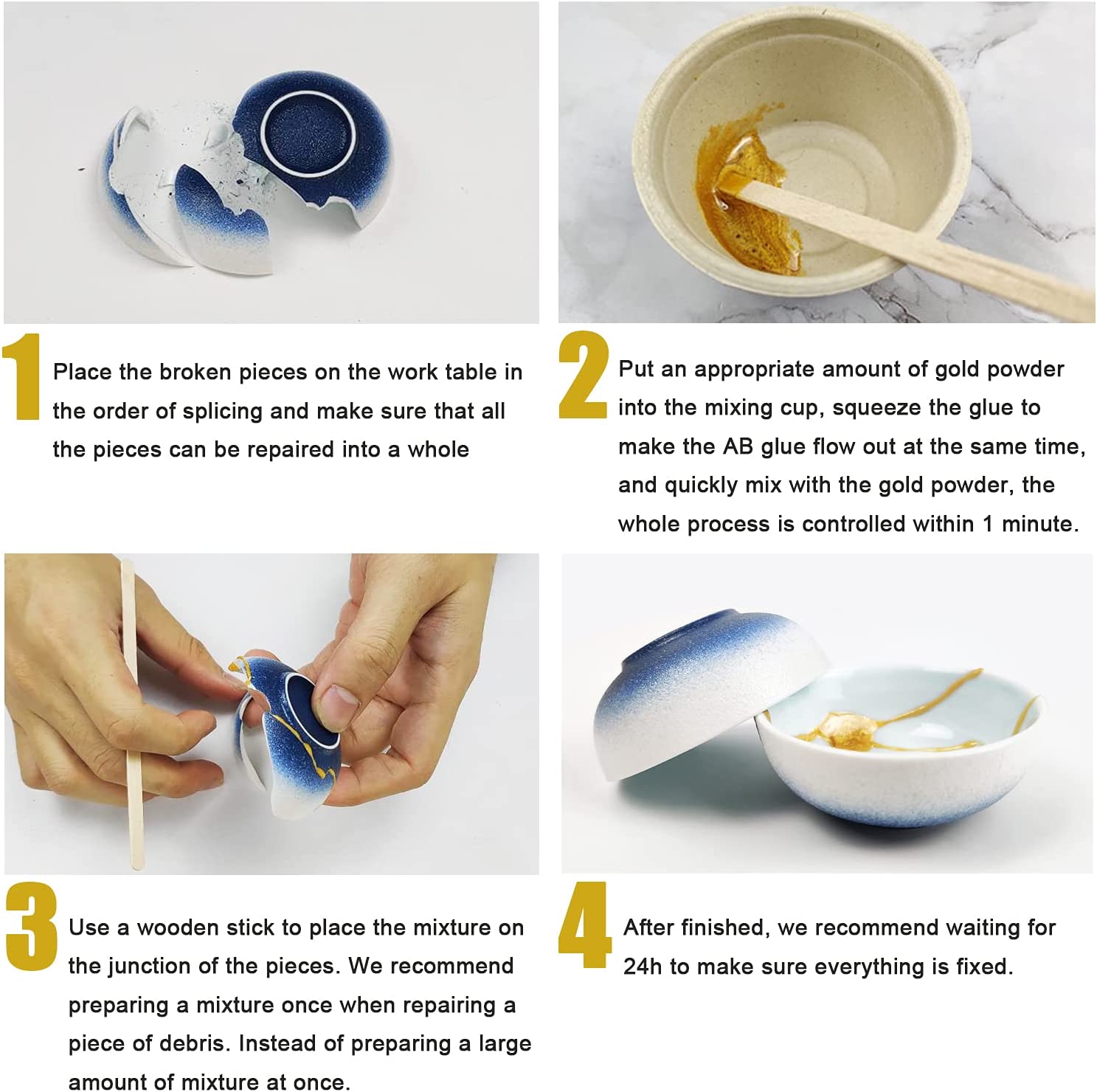 - 【PACKAGE】 Includes instruction, gold powder 20g, 2 practice ceramic cups, glue 25ml, gloves, mixing sticks, a container for mixing, and whatever you need in the process you repair your broken meaningful treasure.