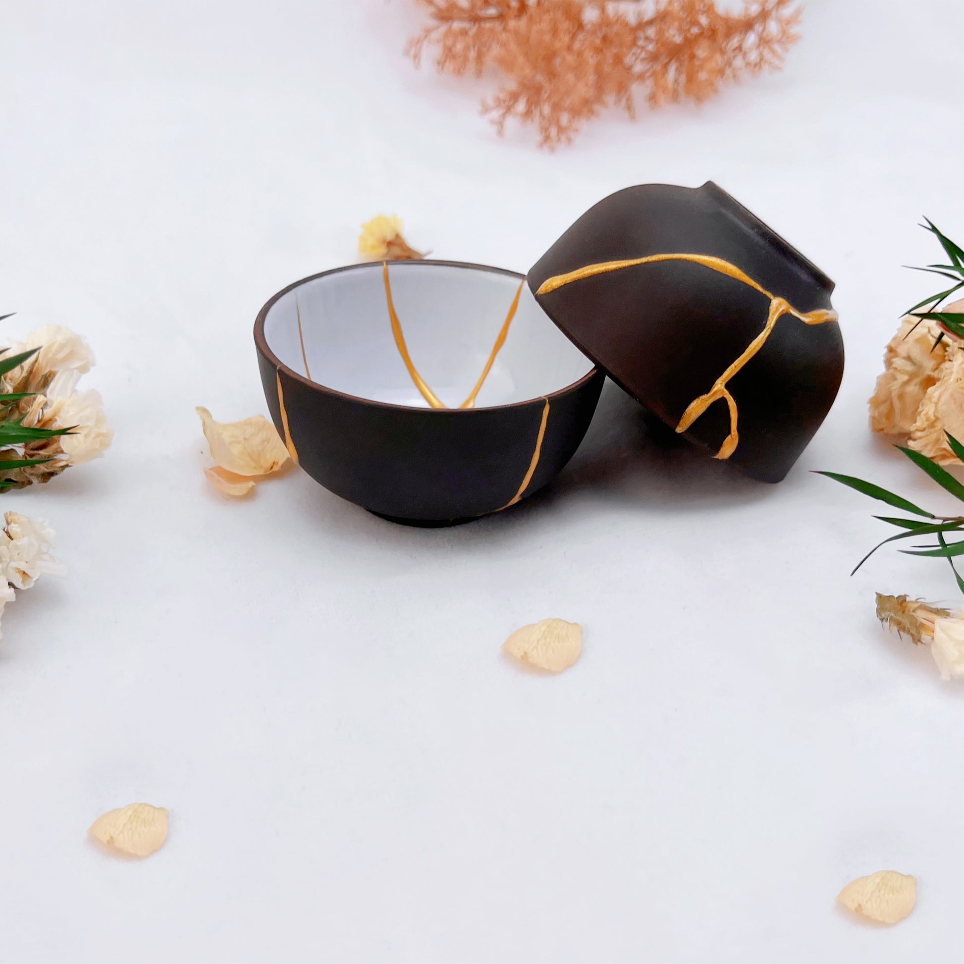 Kintsugi (gold repair) is a Japanese art that aims to restore broken ceramics to reveal new life while showing the 'scars' of their past. This art form adds value to the pieces by fixing them with precious metals, such as liquid gold.